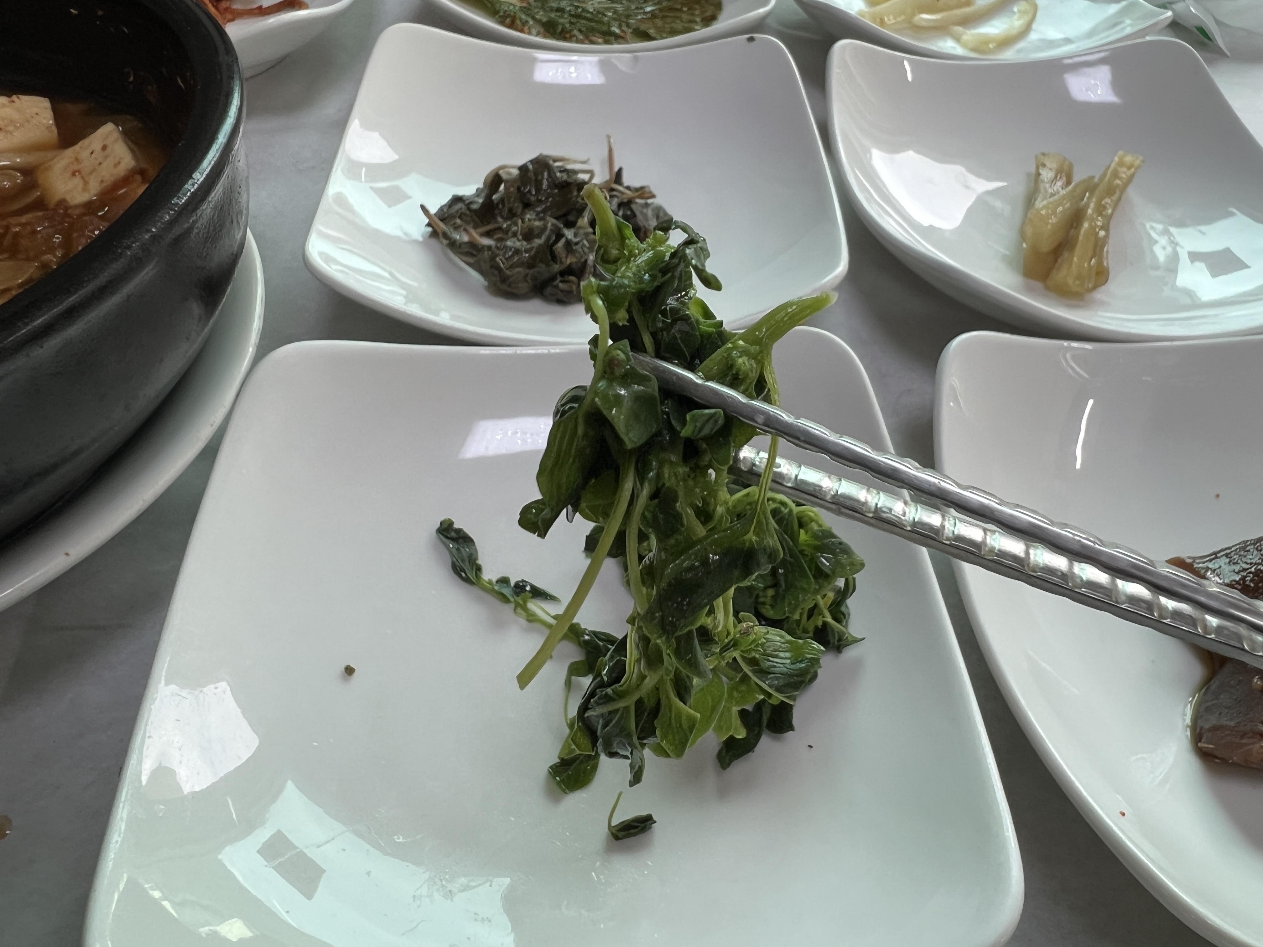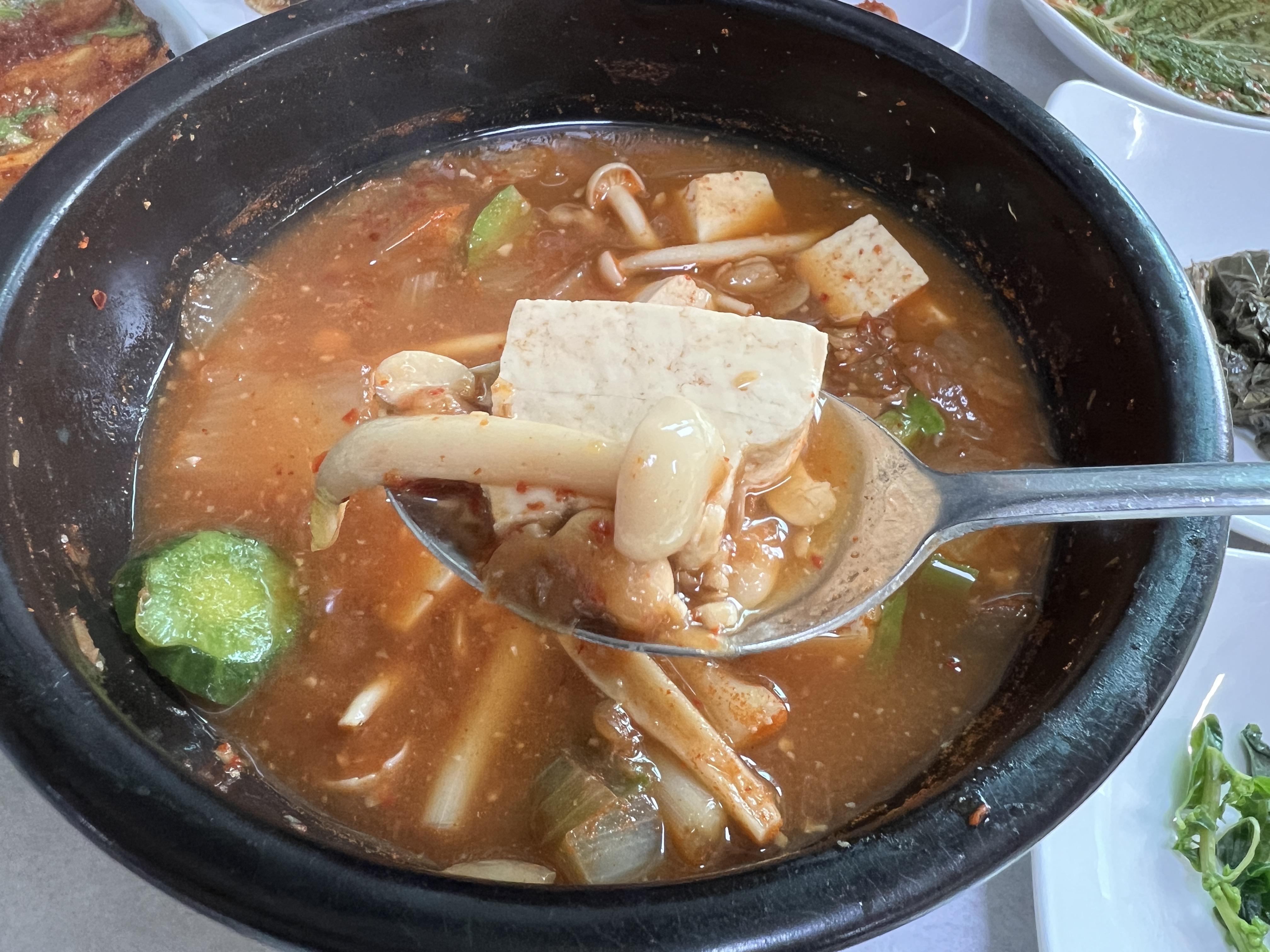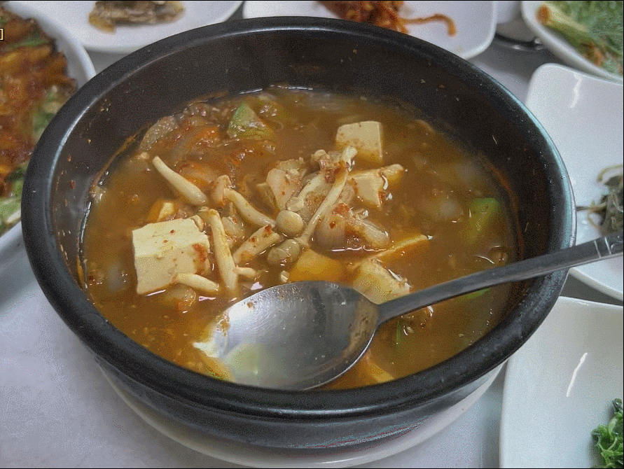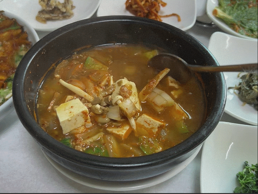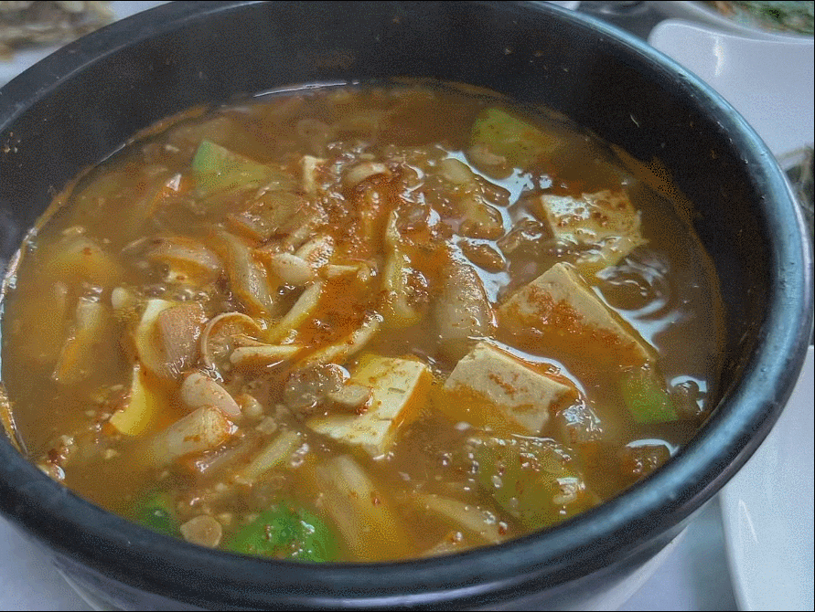 사진 찍는 잠깐 동안 된장찌개가 반이 없어졌습니다.