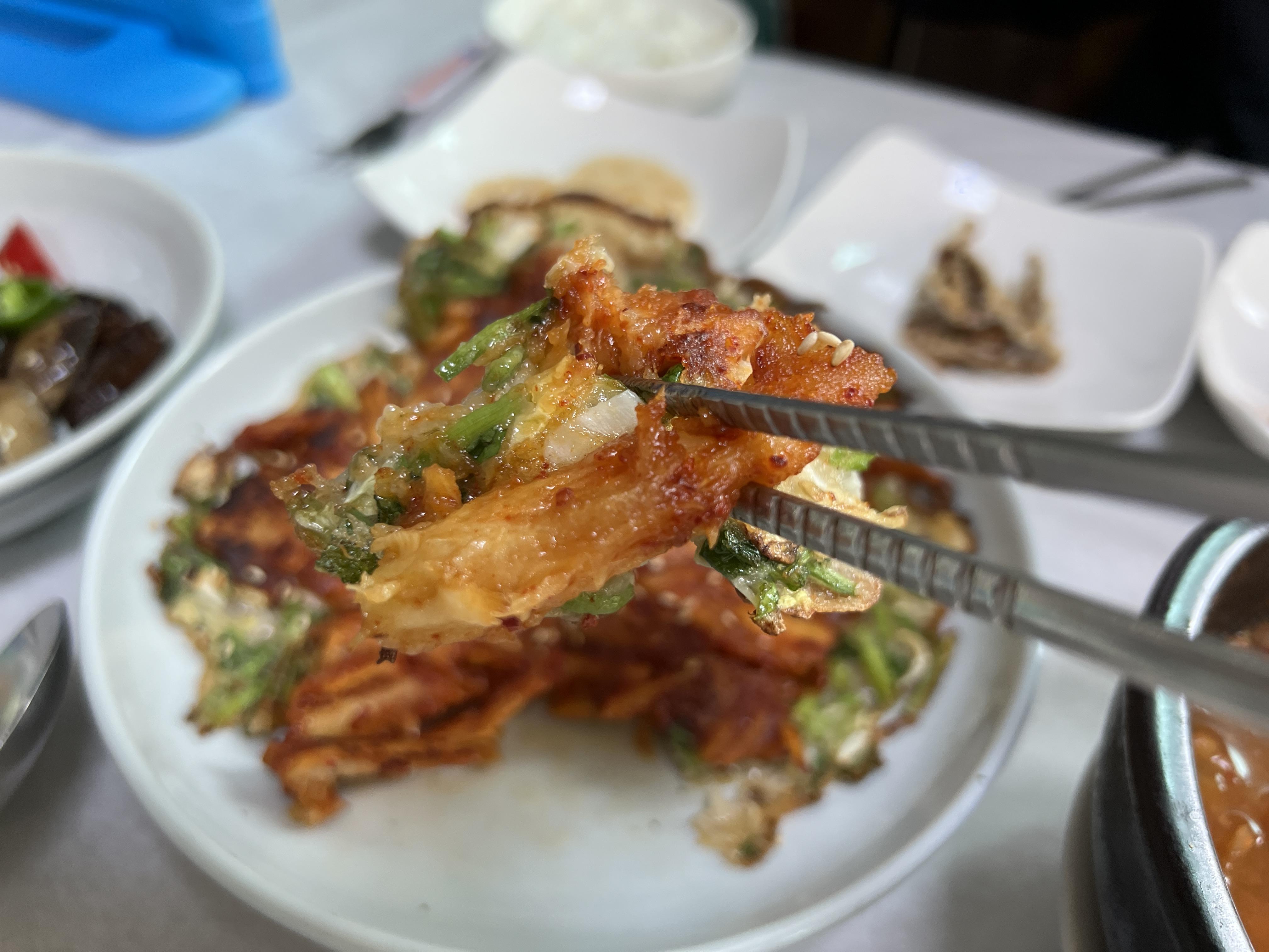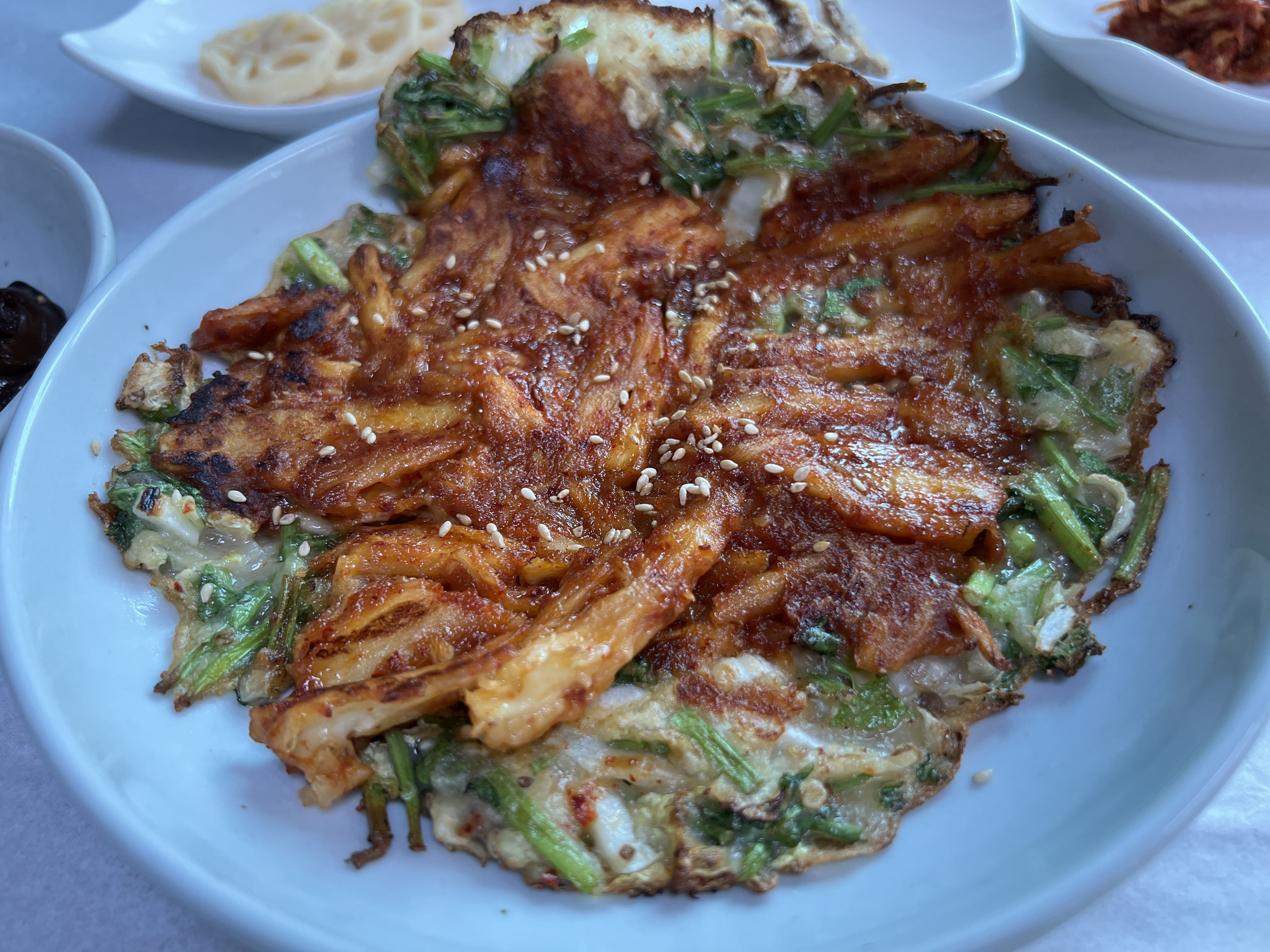밀가루, 미나리, 더덕, 기름의 맛이 참 조화롭습니다.